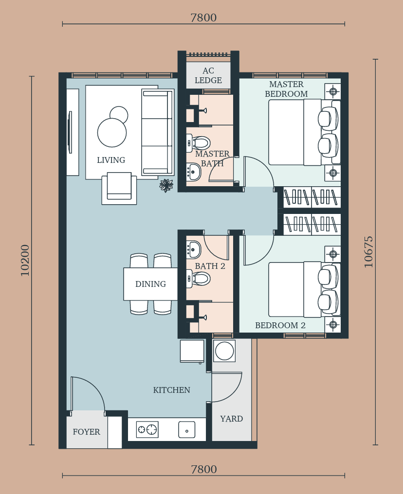 - Type B: 2 Rooms, 2 Baths (775 sqft) – Perfect entry for young professionals and couples.