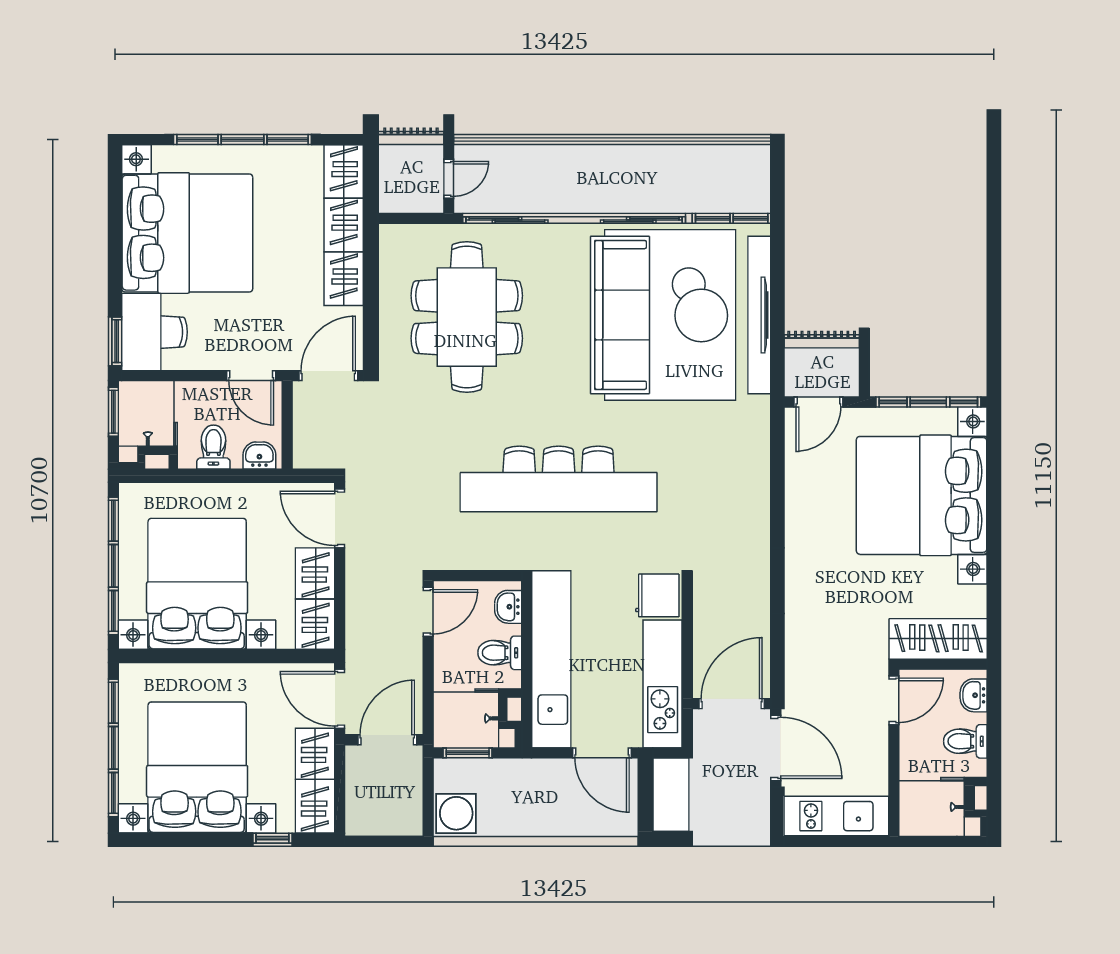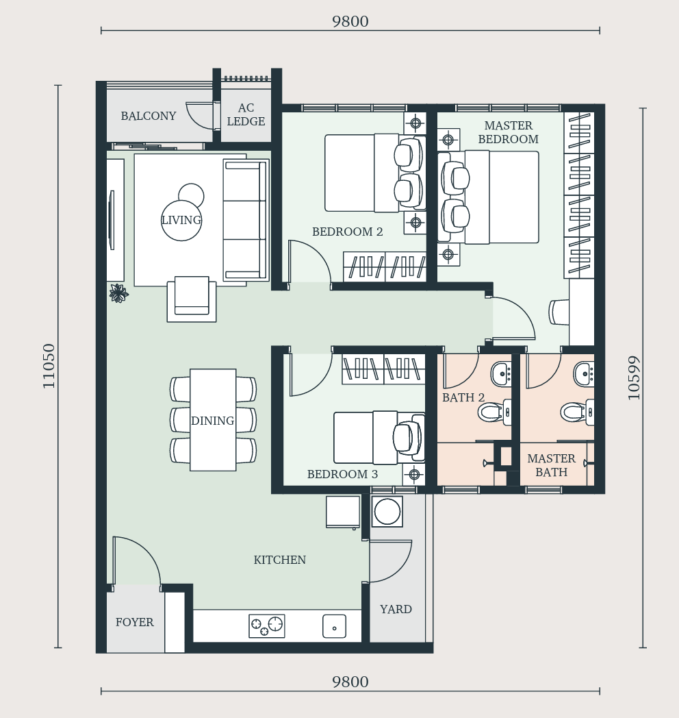 - Type C: 3 Rooms, 2 Baths (1,022 sqft) – Ideal, comfortable space for small to growing families.